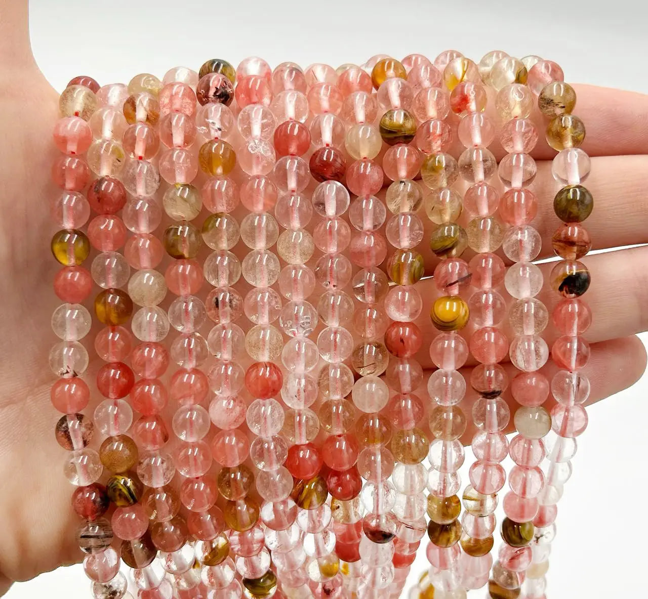Бусини з полуничного кварцу універсальні та легко вписуються як у елегантні, так і в повсякденні образи.