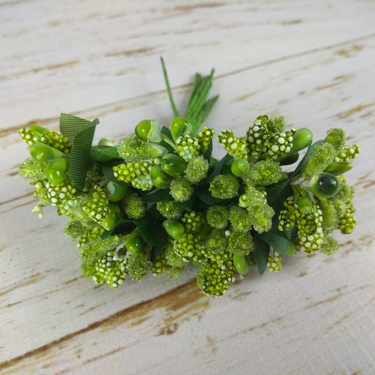 Каждый стебелек украшен тканевыми листиками и несколькими тычинками (глянцевые, сахарные и с мелкими шишечками).