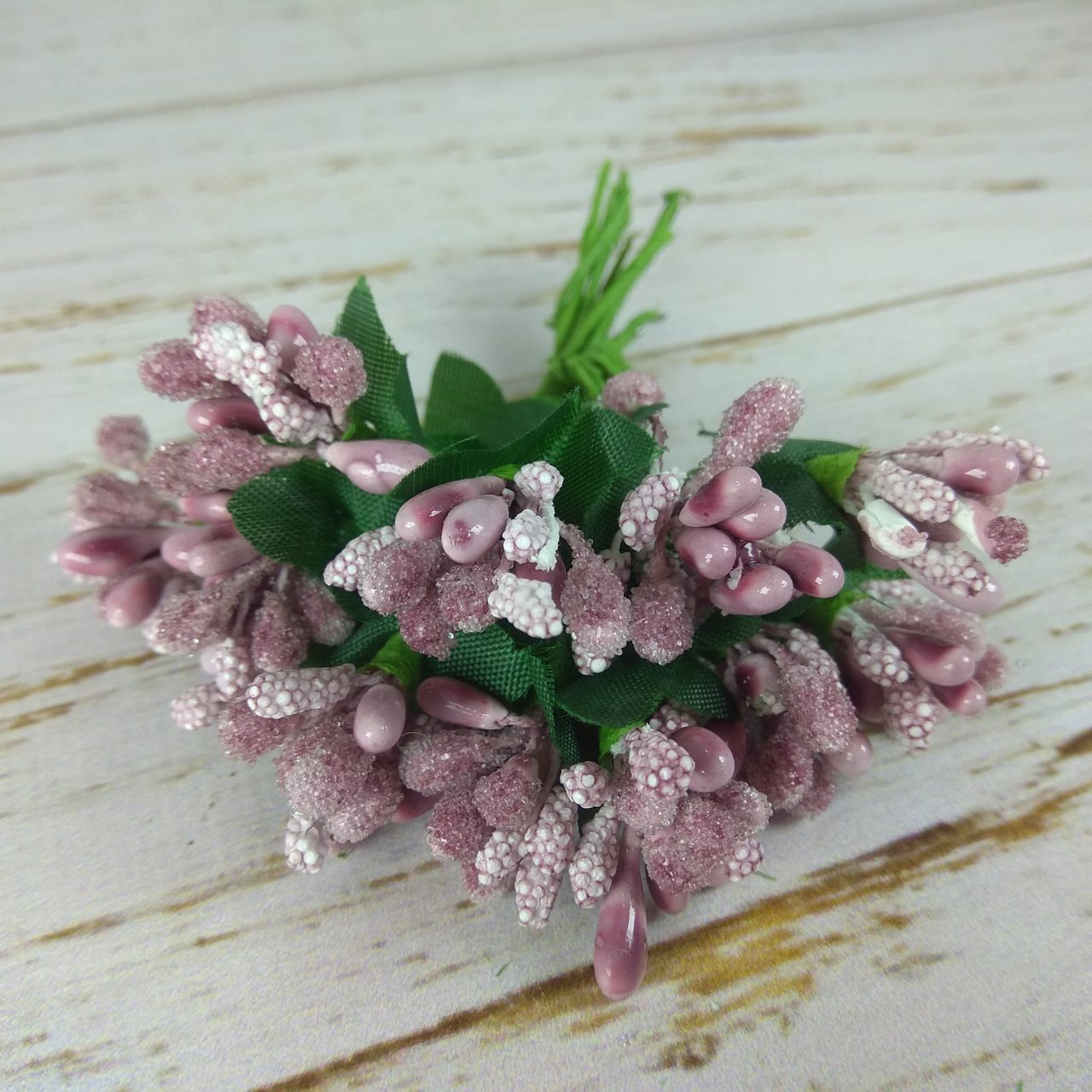 Каждый стебелек украшен тканевыми листиками и несколькими тычинками (глянцевые, сахарные и с мелкими шишечками).