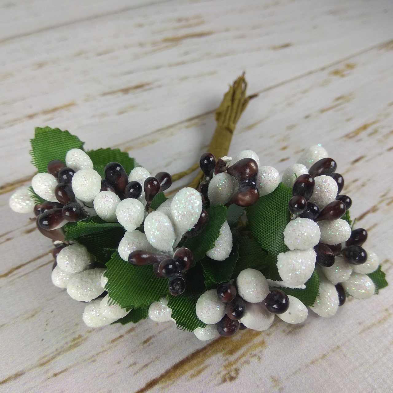 Каждый стебелек украшен тканевыми листиками и тычинками (глянцевые, сахарные и с крупніми блестящими шишечками).
