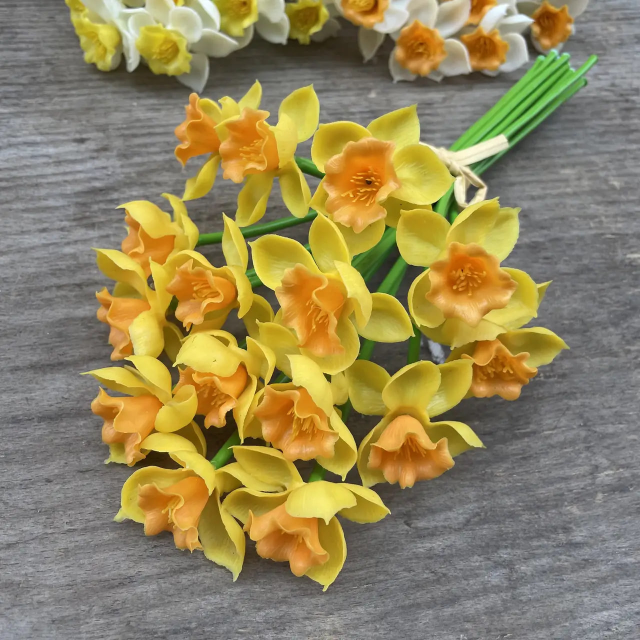 Ці штучні гелеві нарциси, заввишки 20 см, складаються з 3 квіток, кожен із яких має жовті пелюстки з оранжевою серединкою.