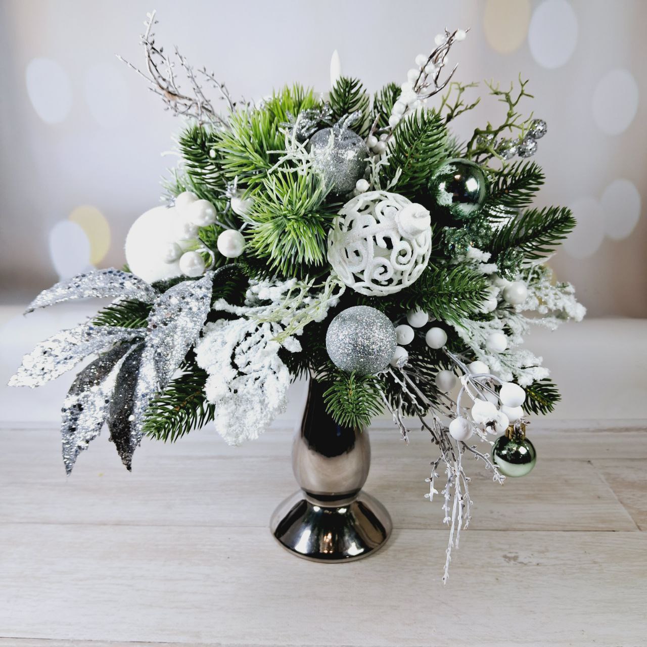Вишукана композиція зі штучної хвої та декоративних елементів у срібно-білому відтінку.