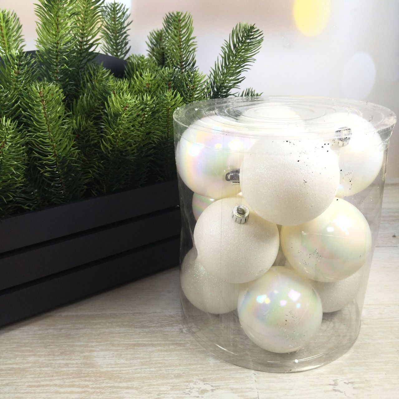 Набір ялинкових куль 8см, 12шт; колір – білий, 6шт – перламутр, 6шт – глітер 147-138