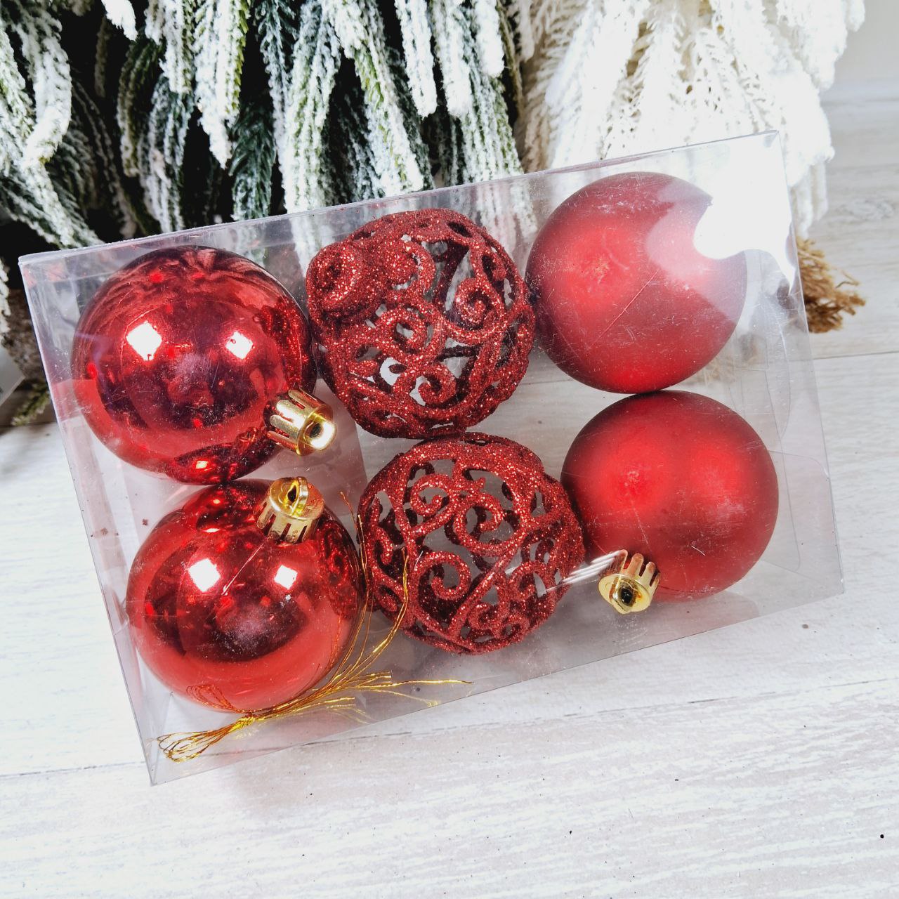 Набір ялинкових куль Ажур, 6 см, колір – червоний, 6шт: 2шт – матовий, 2шт – глянець, 2шт – ажур гліттер