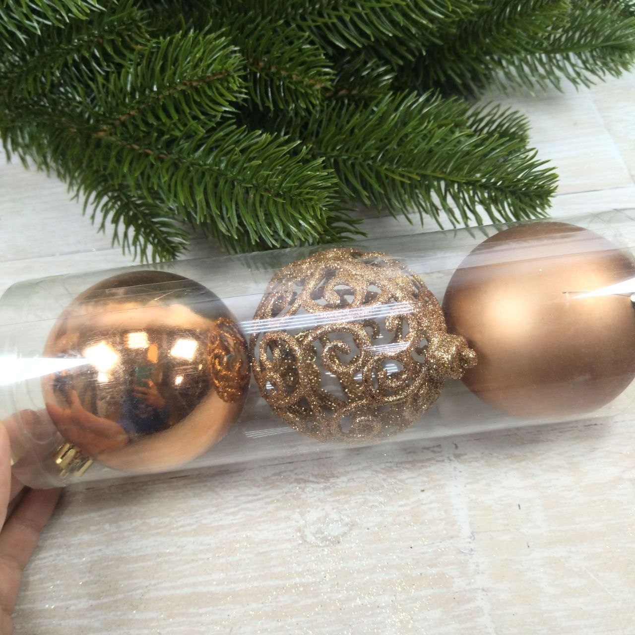 Набір ялинкових куль Ажур, 8см, колір – карамель, 3шт: 1шт – матовий, 1шт – глянець, 1шт – ажур гліттер 147-552