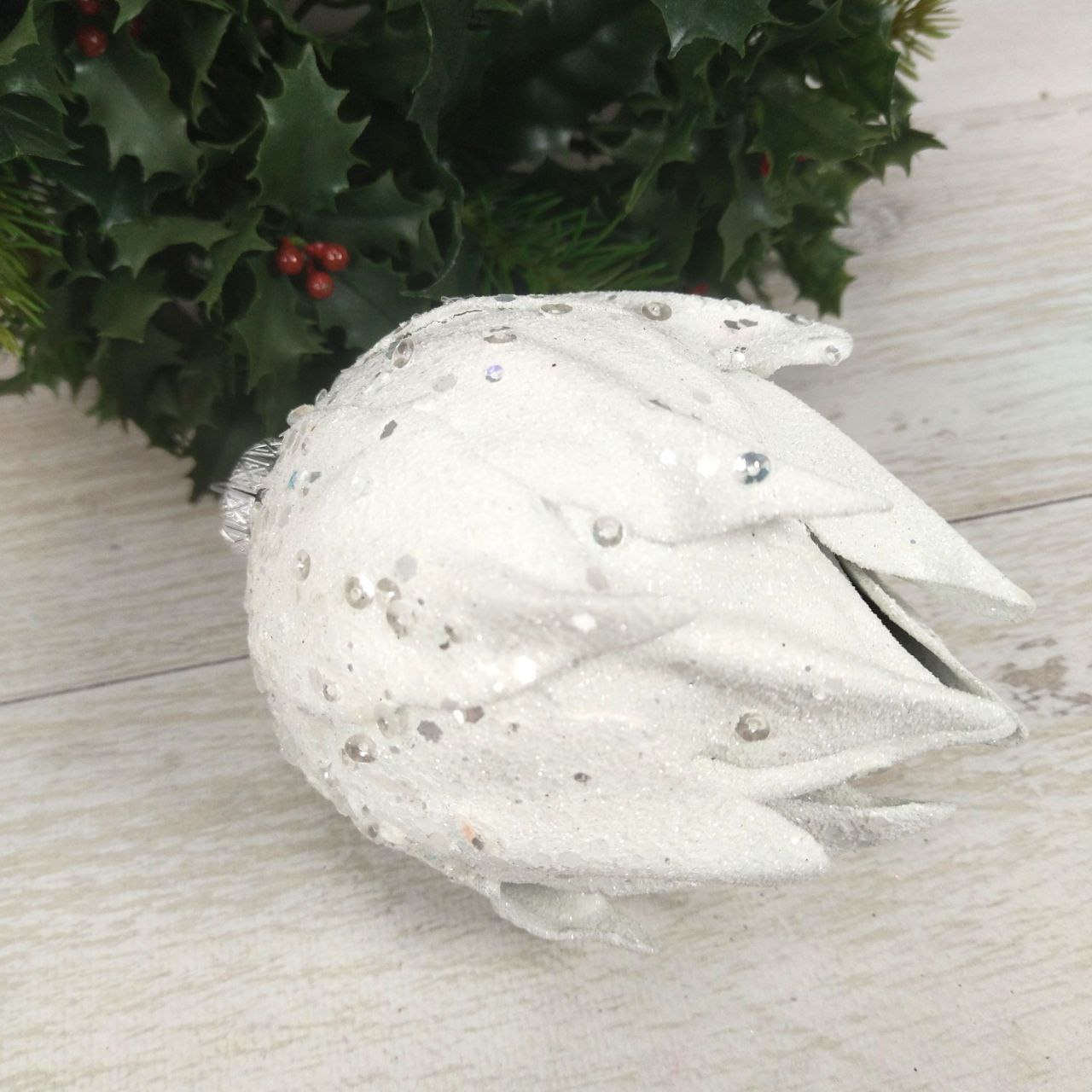 Новорічні прикраси. Ялинкова куля артишок, 10 см. Біла з крижинками.