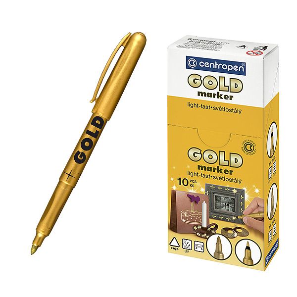 Перманентний маркер із золотим чорнилом. Підходить для письма та малювання на різних поверхнях. Чорнило має насичений металевий колір та стійкість на папері та інших пористих матеріалах. Світлостійке чорнило на водній основі. Товщина лінії становить 15-3 мм. Зберігати у горизонтальному положенні.
