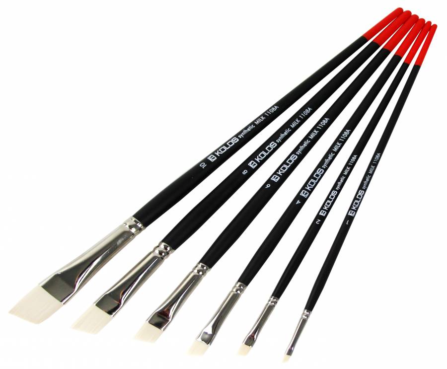 Стандартная выставка рабочей части. Синтетическая кисть MILK сделана из эластично-упругого волоса, который отлично имитирует щетину, но при этом кисть служит в разы дольше натурального волоса. Подрезанная под угол плоская кисть с коротким ворсом. Кончик кисти позволяет быстро и уверенно изменять объем волоса несущий краску, данная часть – превосходный инструмент для создания перехода одного цвета в другой в труднодоступных, узких, мелких участках картины.