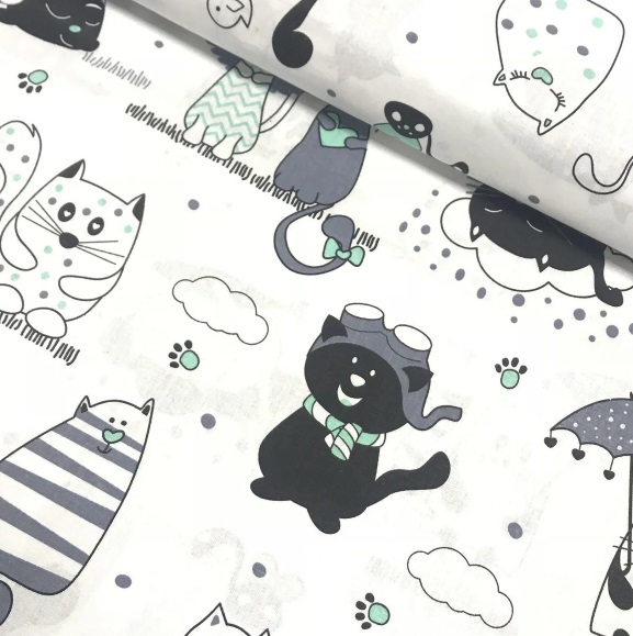 Хлопковая ткань (бязь) 160см “Коты черные и серые с мятным” на белом