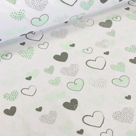 Хлопковая ткань (бязь) 160см “Сердца мятные, серые с точками и полосками” на белом (0,5*1,6м)