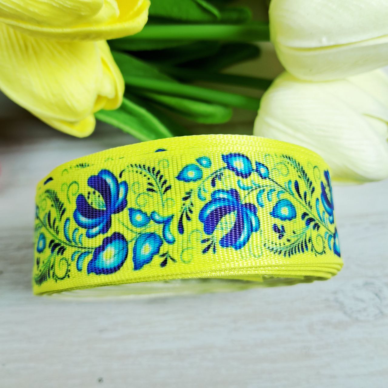 Главная страница » Магазин » Стрічки Мереживо Тасьма Бахрома » Ленты » Лента репсовая » Стрічка репсова 2,5см Петриківський розпис блакитна на жовтому фоні