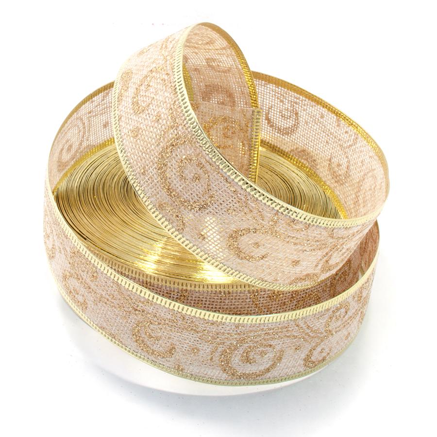 Новогодняя лента мешковина Метель 3,8см Кремовый с золотом