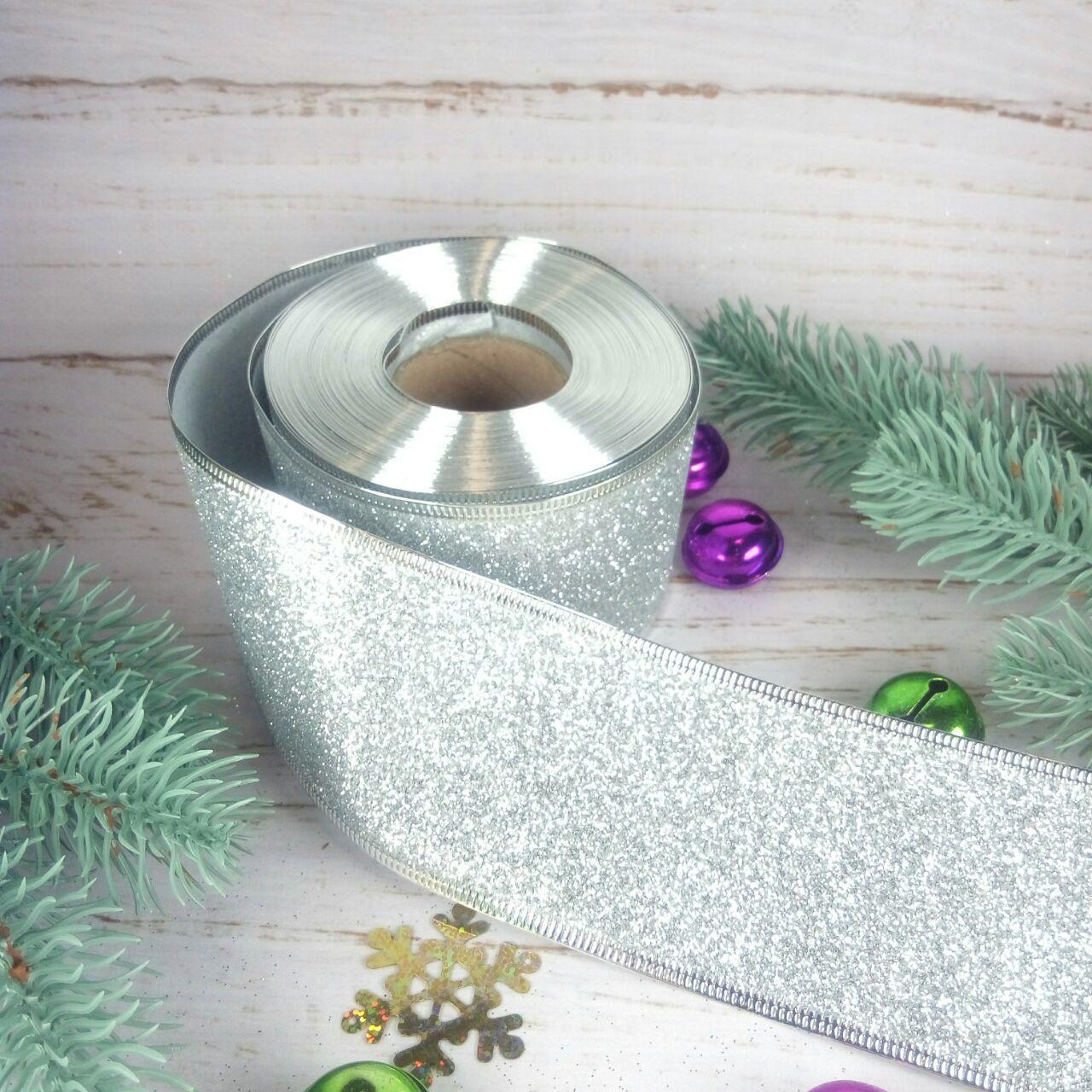 Стрічка Новорічна з гліттером 6,5см срібло