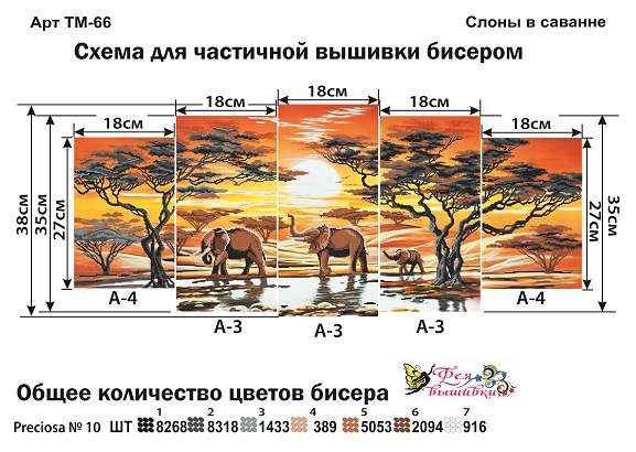 Фея Вышивки ТМ-66 Слоны в саване. Триптих, схема под бисер
