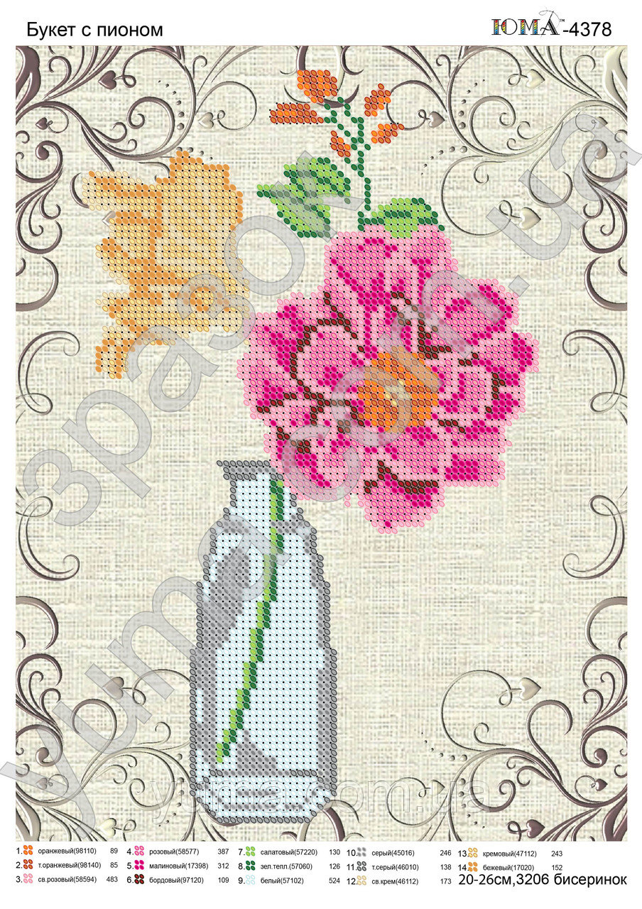Схема для вышивки бисером на атласе “Букет с пионом” для удобства вышивания подклеена двумя слоями флизелина а сам атлас благодаря своим свойствам предаёт схеме характерный блеск который будет радовать взгляд. Размер 19 см. на 26 см.