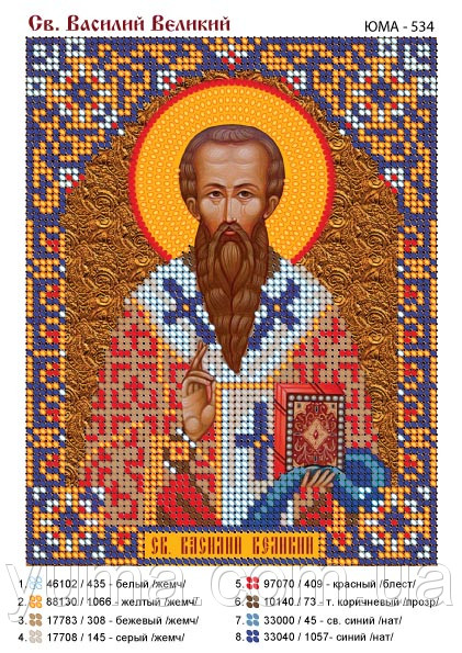 Схема под вышивку бисером на атласе именной иконы “Св. Василий Великий” Схема для частичной вышивки бисером (рекомендовано вышивать чешским бисером №10) на высококачественном атласе