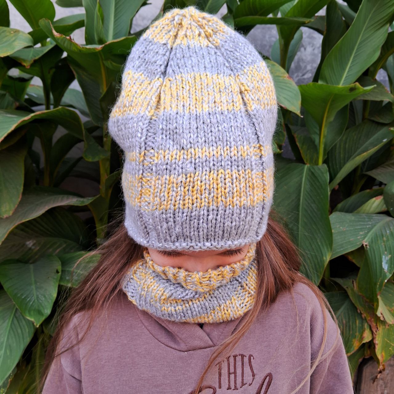 Набір шапочка+шарф-снуд р,50-58 жовто-сіра з люрексом