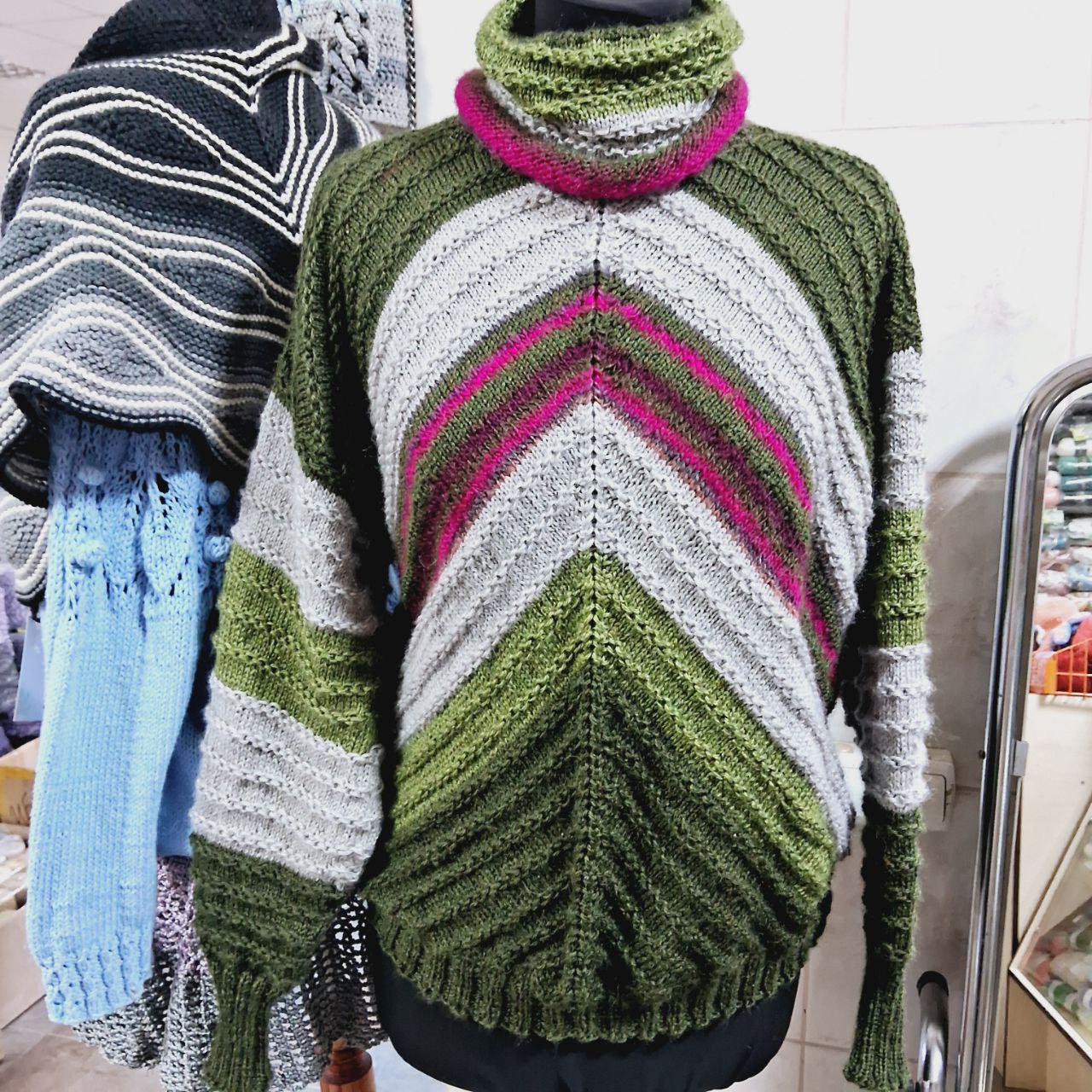 Главная страница » Магазин » Пряжа » В'язані вироби » Светрик в’язаний р46-48 фусiя-хакi