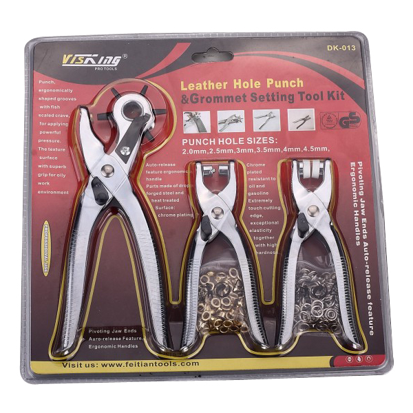 В набор входит пробойник, установщик люверсов, установщик кнопок, набор люверсов, набор кнопок. Пробойник может делать отвверстия размерами 2, 2.5, 3, 3.5, 4 и 4.5 мм. Эргономичные ручки пробойника позволяют удобно обхватить инструмент для нанесения более мощного давления в с лучае работы с плотным материалом. Пробойник и установщики лювверсов хромированый.