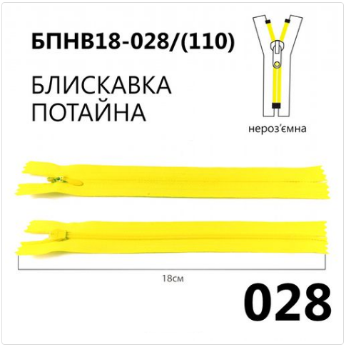 Главная страница » Магазин » Швейка » Молнии Бігунки » Молния потайная, неразъемная, витая, Т3, 18см, нейлон, 028 лимонный