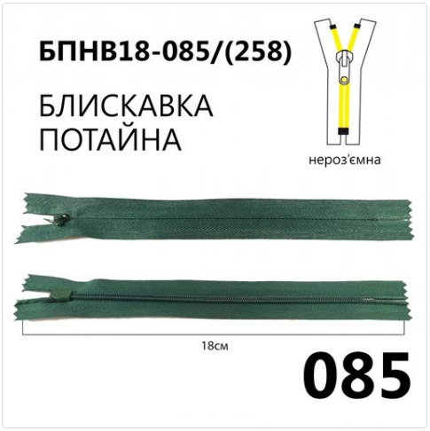 Главная страница » Магазин » Швейка » Молнии Бігунки » Молния потайная, неразъемная, витая, Т3, 18см, нейлон, 085 травяной