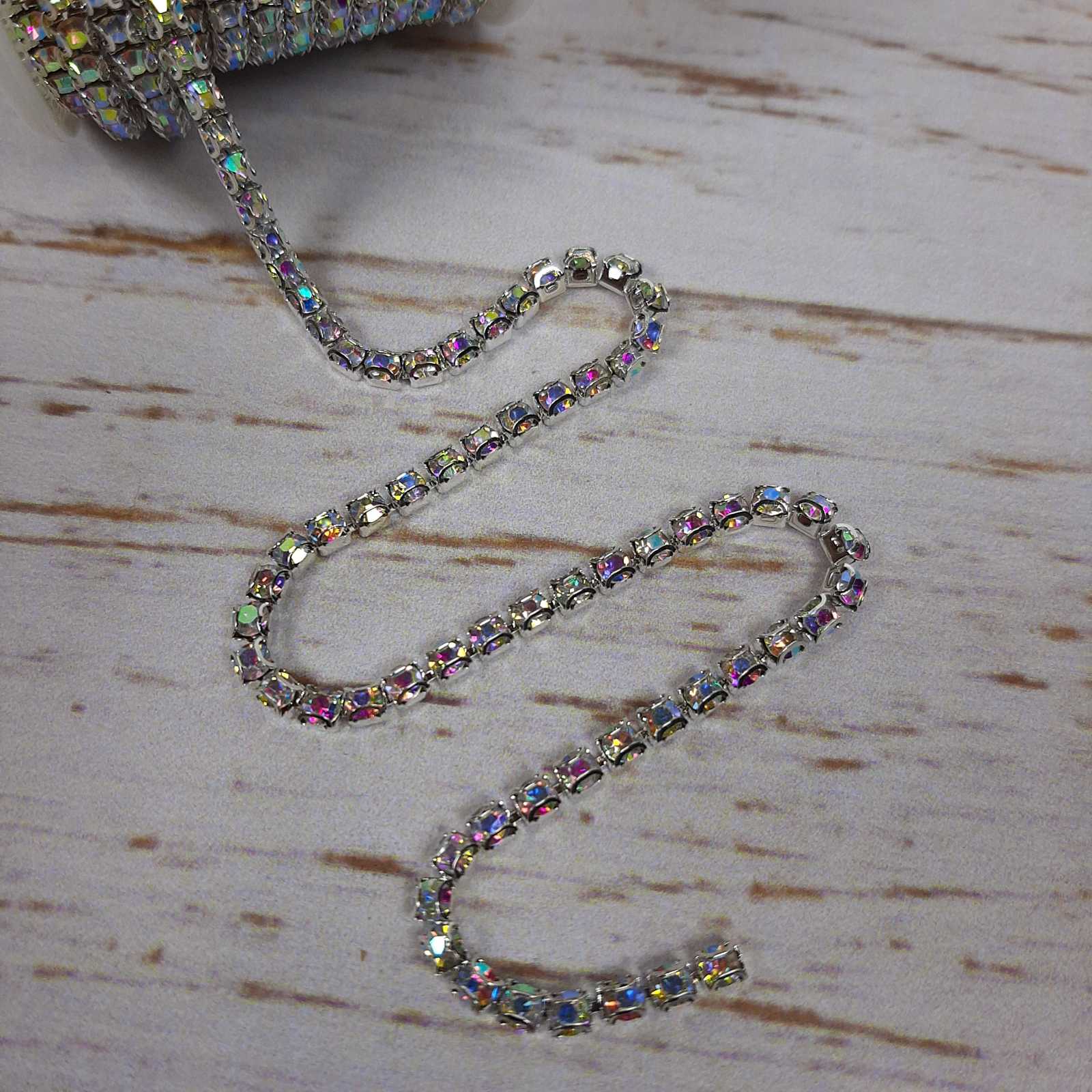 Главная страница » Магазин » Стрази » Имитация страз, стразы на ленте и бобине » Стразовая лента ss12 2мм Кристал АВ в серебре