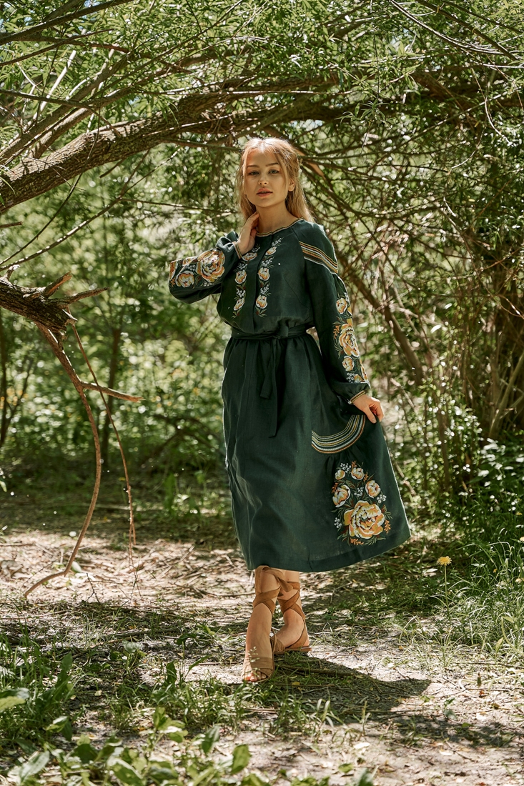 Незвичайна сукня-вишиванка у насиченому зеленому кольорі