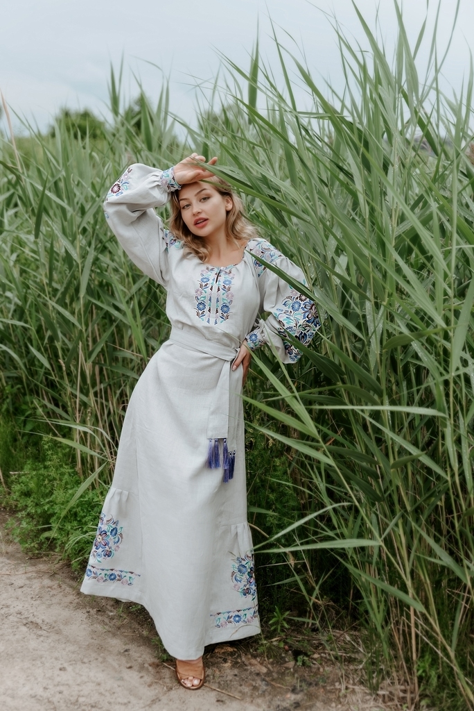Сукня сіра з квітковою вишивкою.