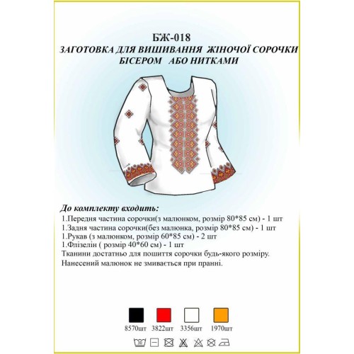 У набір входить передня частина 80см * 85см з нанесеним малюнком 1 шт, спинка 80см * 85см без малюнка 1 шт, рукава 60см * 85см з малюнком 2 шт, флізелін 40см * 60см
