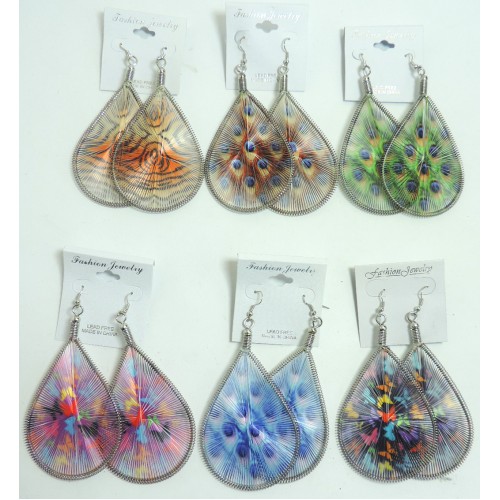Серьги сделаны гипоалергенного металла под серебро в виде капли с проволки на которой натянута тонкие нити, которые образовывают орнамент, что напоминает птичьи перья. Длина женских сережек под серебро составляет 11 мм. Замок сережек сделан в виде французской петли. Цена за 1 вид на выбор