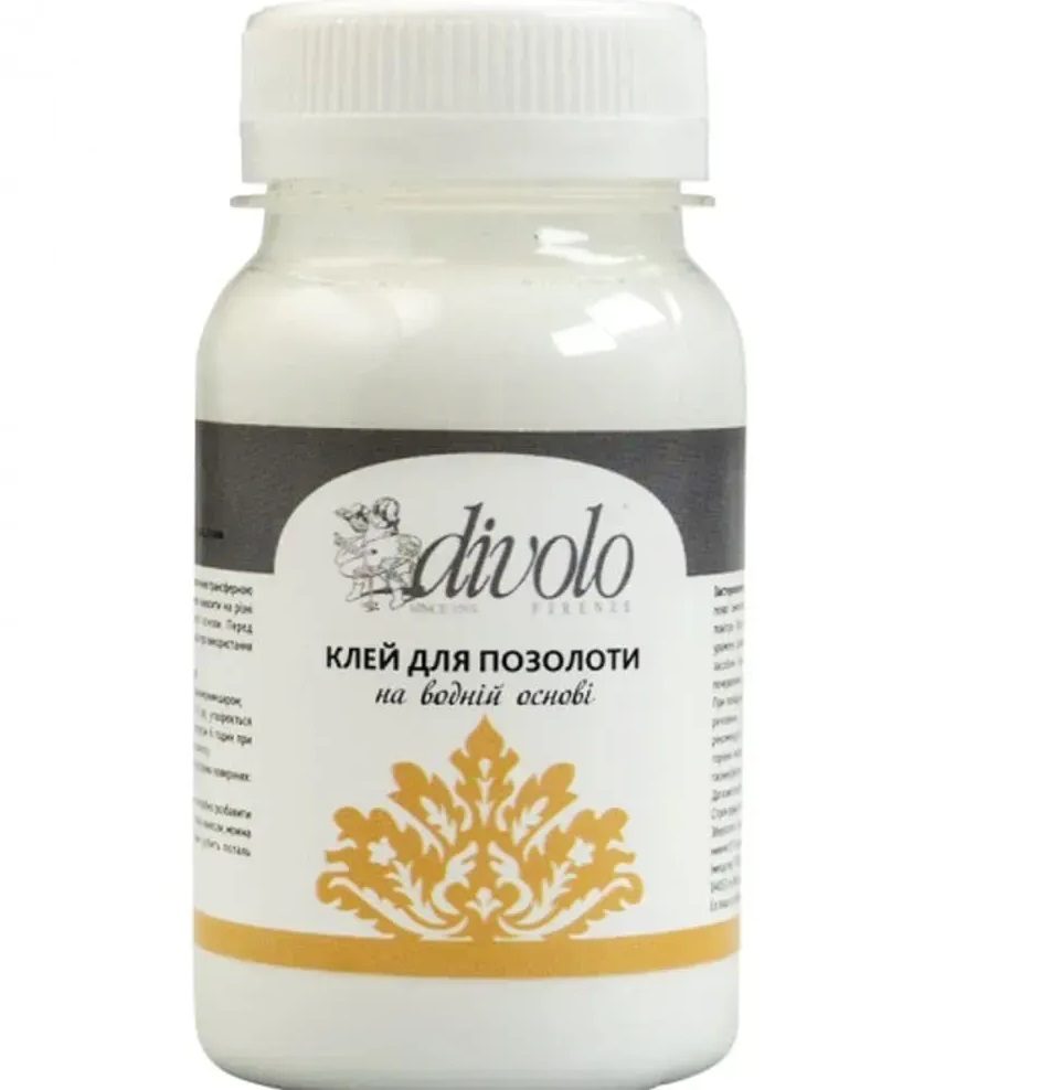 Клей для позолоты Divolo Микстион объемом 100 мл на водной основе. Используется для приклеивания золотой и металлической сталь на различные поверхности, обеспечивая безопасное и удобное нанесение без запаха.