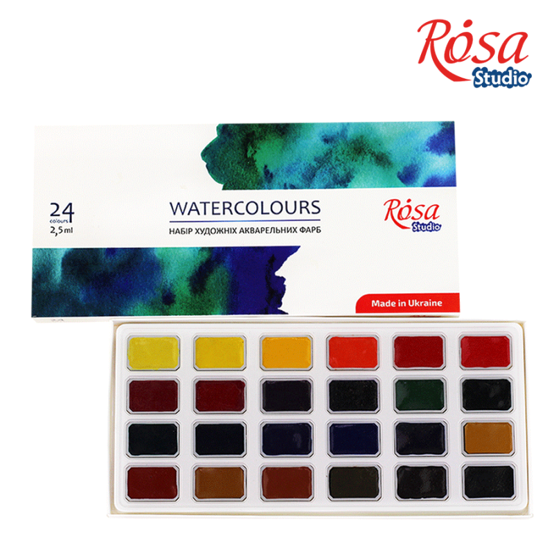 Набори акварельних фарб ROSA Studio на 16 та 24 кювети сформовані з традиційних для акварельної техніки кольорів. Шляхом їхнього змішування можна легко отримати нові потрібні кольори та відтінки. Якісні пігменти забезпечують насиченість, чистоту та прозорість кольорів. В’яжуче на натуральній рослинній основі з вмістом гуміарабіку дозволяє досягти відмінного рознесення фарб по поверхні.