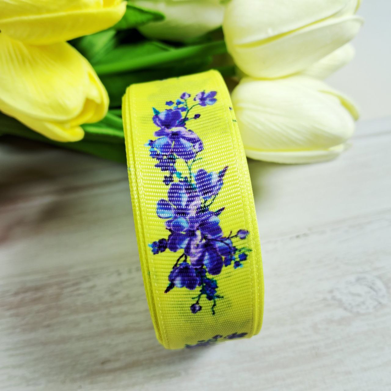 Главная страница » Магазин » Стрічки Мереживо Тасьма Бахрома » Ленты » Лента репсовая » Стрічка репсова 2,5см Барвінок на жовтому