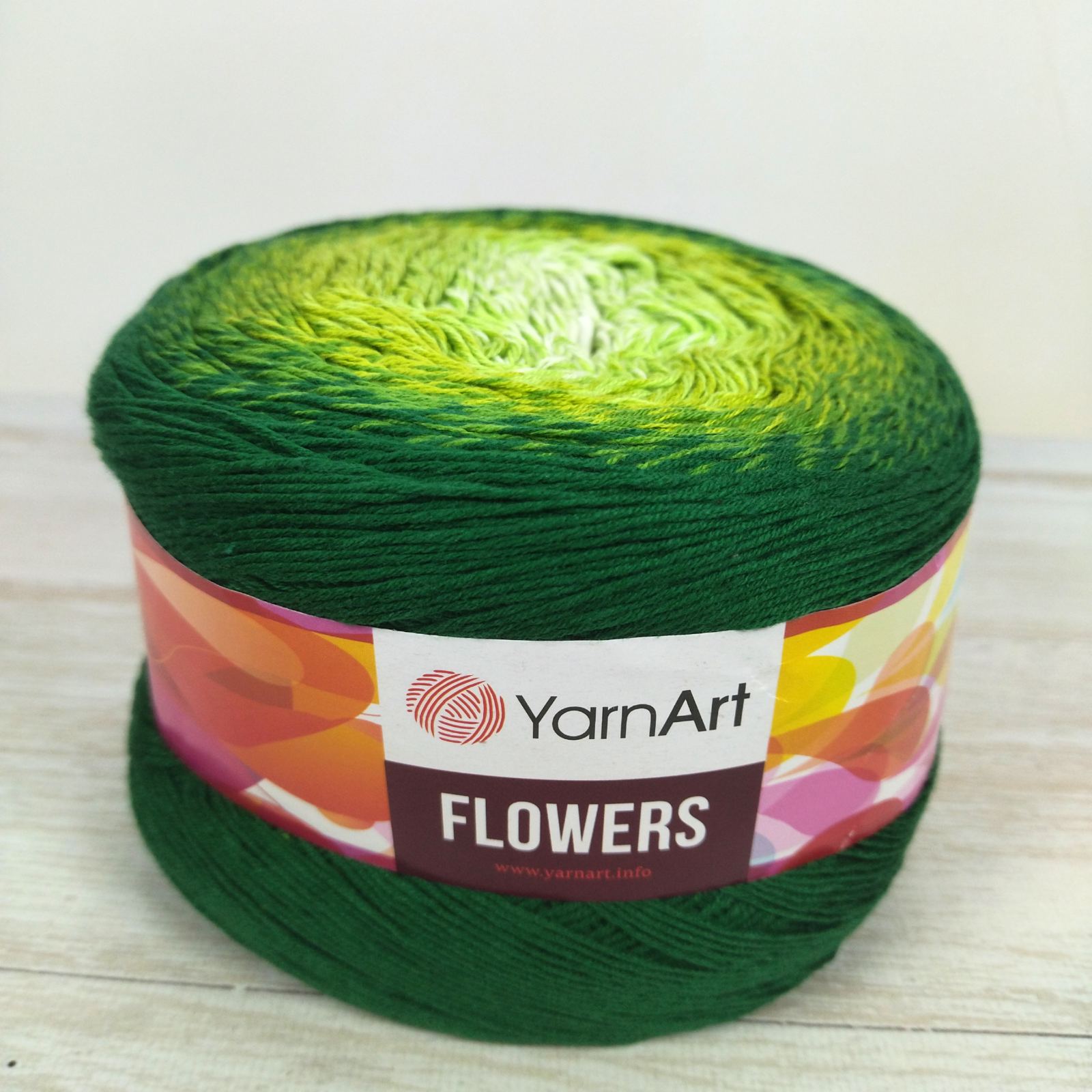 Ярнарт Флауерс – це пряжа секційного фарбування та малюнок лягає смужками, виробник підібрав гарні соковиті переходи та поєднання кольорів, досить тонка і виріб виходить легким, добре драпірується.
