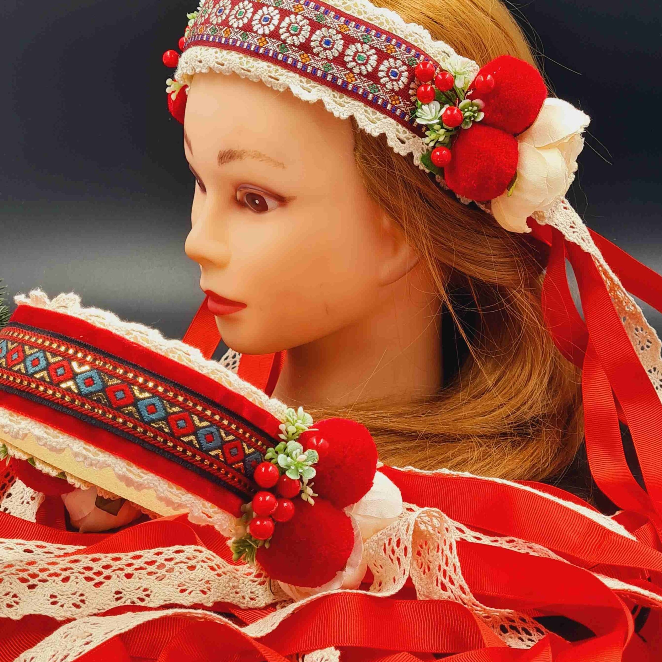 Віночок-чільце з помпонами червоний стрічки 68см 287054