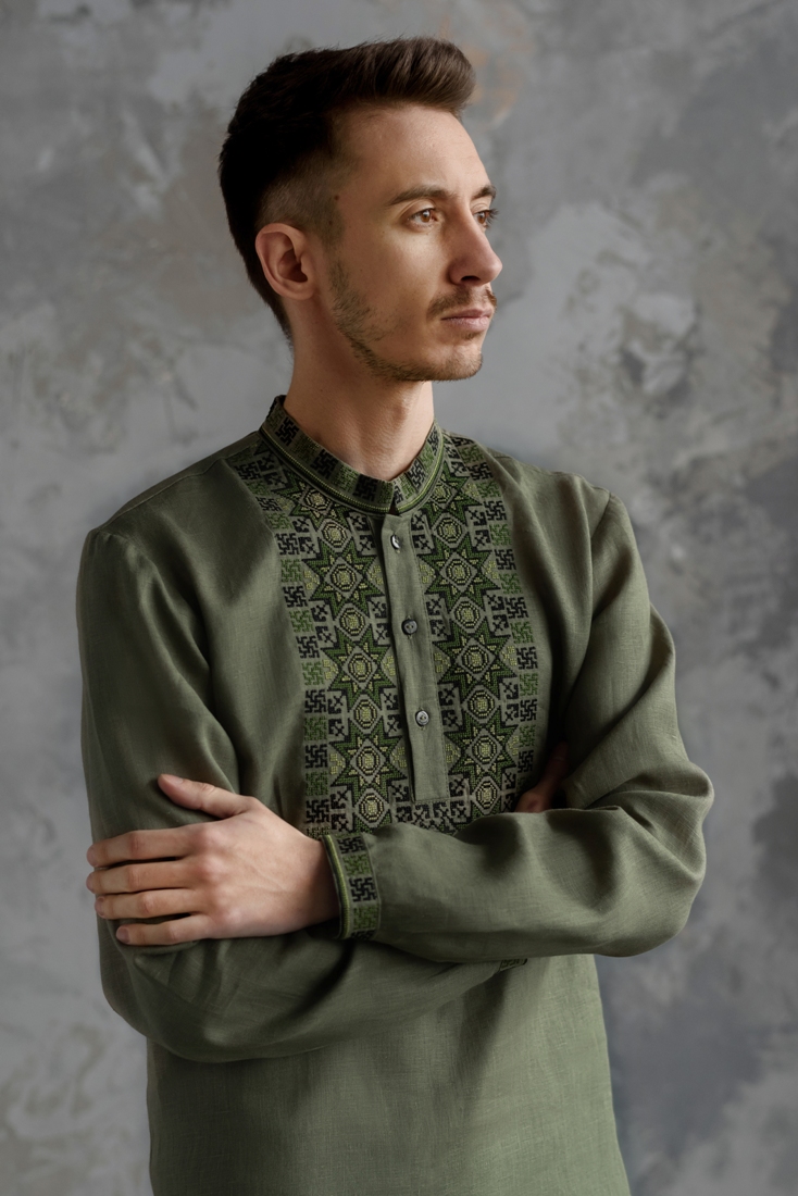 Сорочка чоловіча з гладкофарбованого льону, вільного крою, з вишитою пилкою по центру, з центральною застібкою-планкою