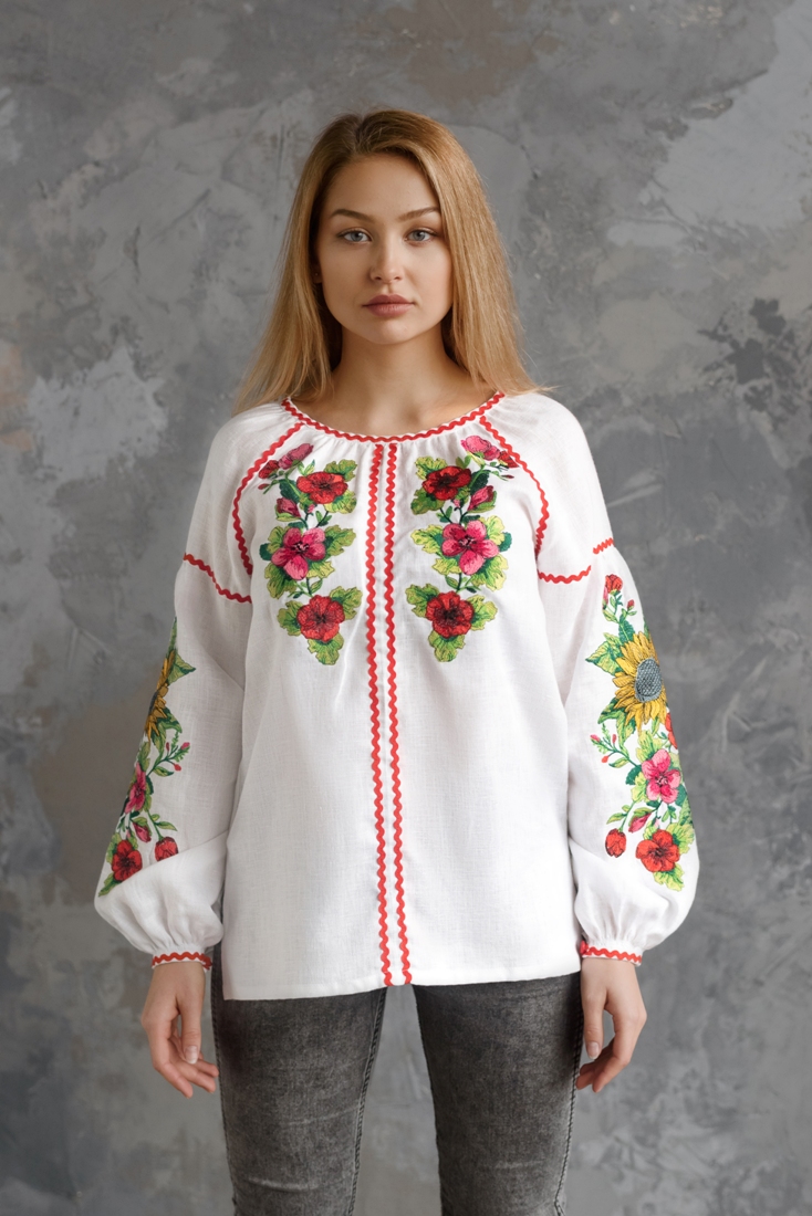 Ексклюзивна вишита сорочка із натурального льону з вишивкою у вигляді великих соняшників на широких рукавах.